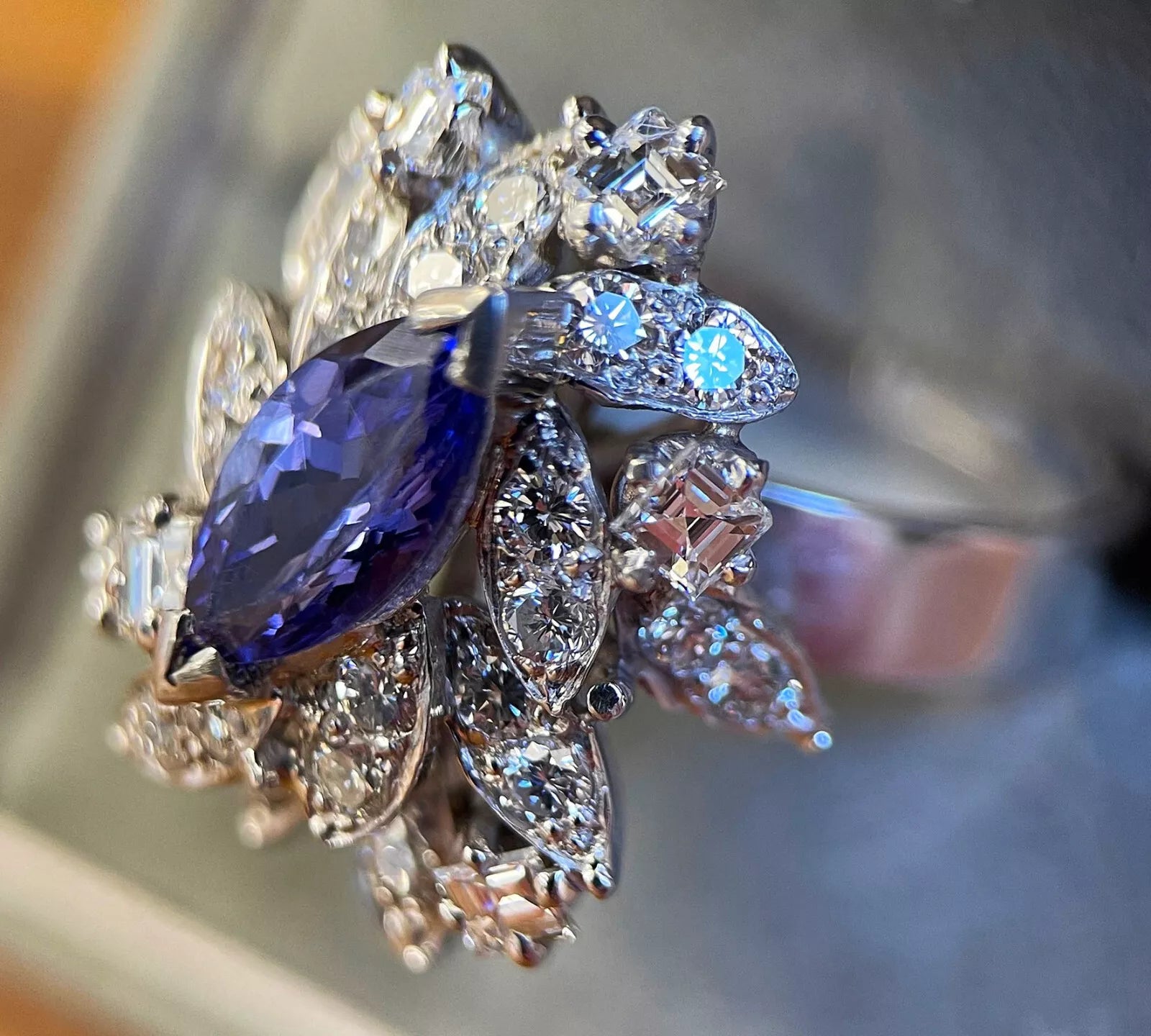 This stunning ring showcases a beautiful cluster of diamonds around a natural Marquise Tanzanite stone